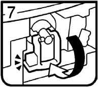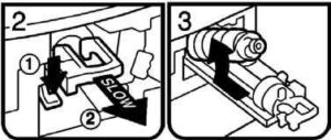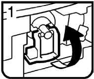 Bước 1: Khi máy photocopy Ricoh báo đèn màu đỏ, chúng ta mở cửa trước bật cần khoá xanh lá lên.